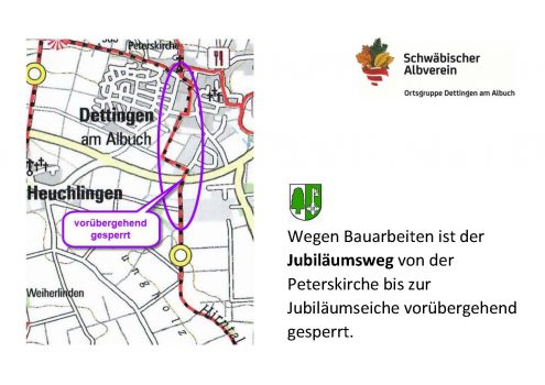 Dieser 15 Kilometer lange Jubiläumsweg wurde zum 100-jährigen Bestehen der Ortsgruppe Dettingen angelegt. Eine abwechslungsreiche albtypische Landschaft begleitet die Tour.